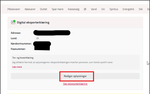 4. Rediger dine oplysninger Hvis du allerede har en aktiv eksporterklæring liggende, vil du se dine nuværende oplysninger. For at rette i dem skal du trykke på knappen "Rediger oplysninger". Nu bliver felterne redigerbare, og du kan slette det gamle pas- eller kørekortnummer og indtaste det nye.